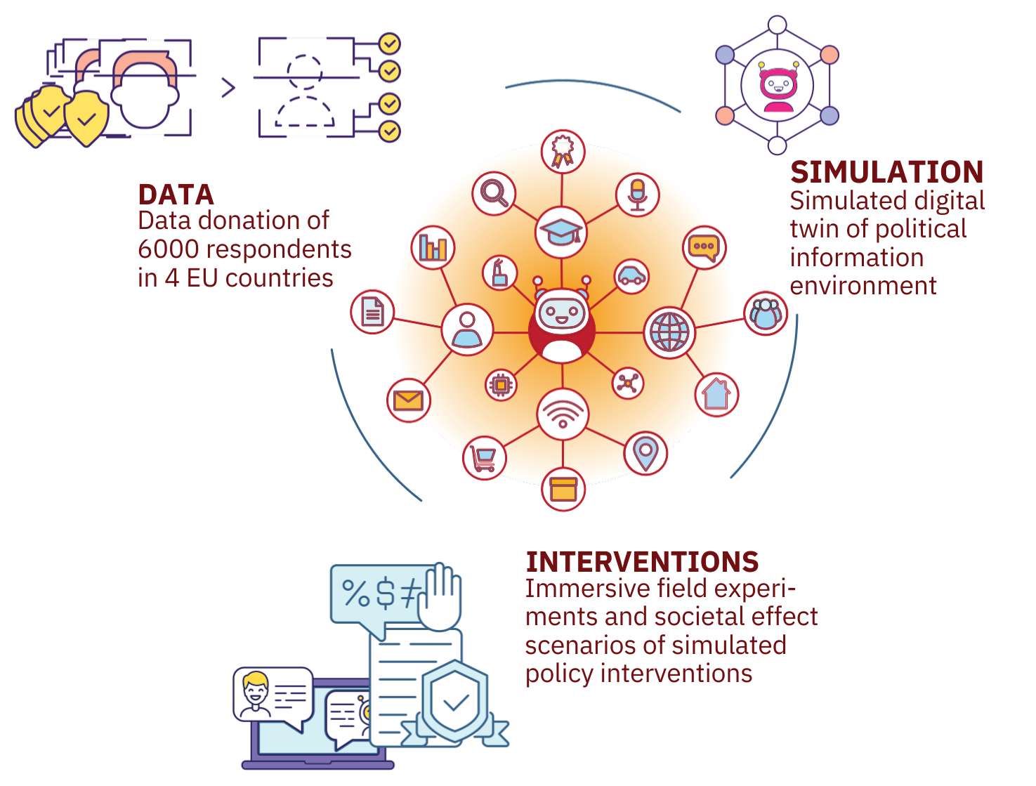 The rise of disinformation and hate speech poses significant challenges to our democracies. WHAT-IF develops a digital twin of the digital political information environment to test the effects of interventions, fostering healthier democratic discourse.