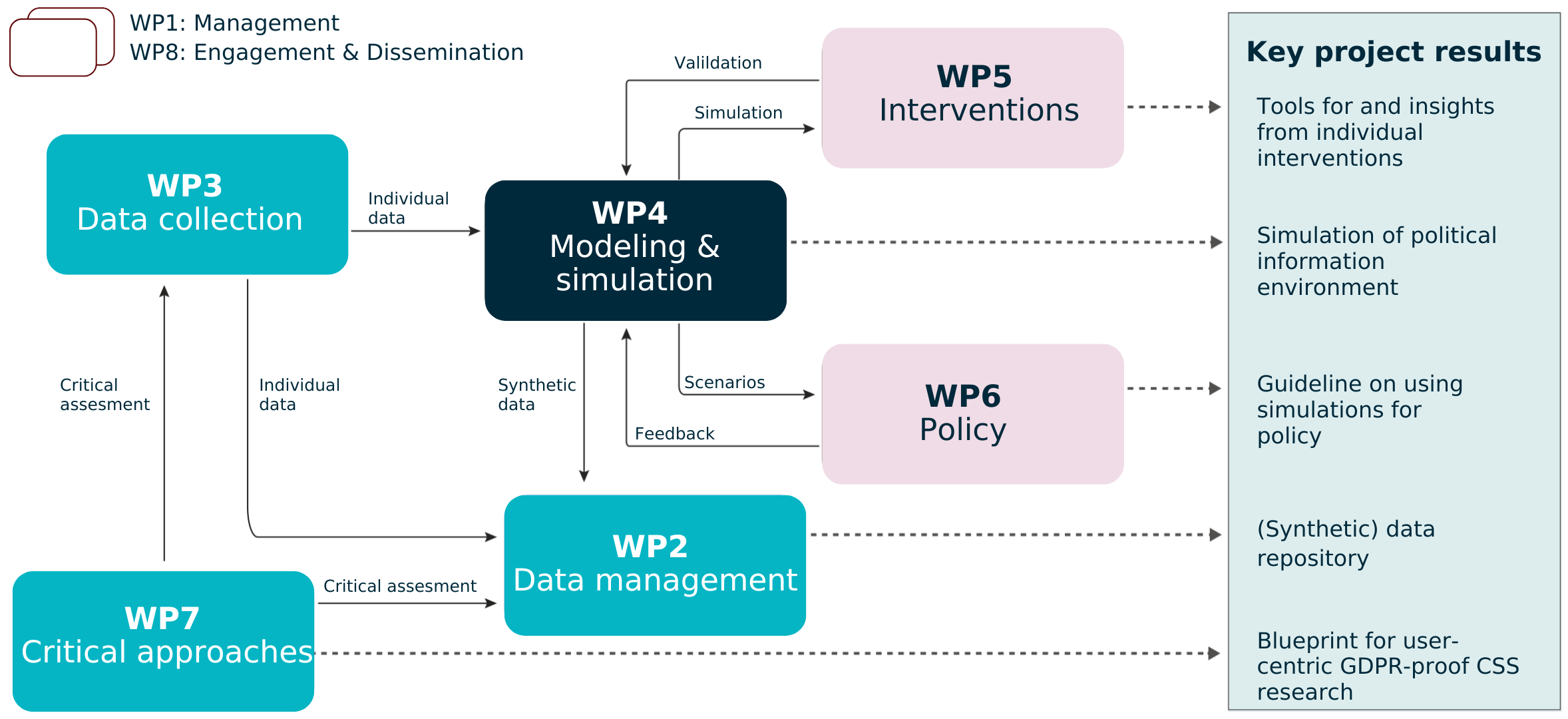 Collects fine-grained data through surveys and digital trace donations from citizens in four EU countries. Processes and prepares this data for simulations and analyses.Agent-Based Modeling and Simulation (WP4)